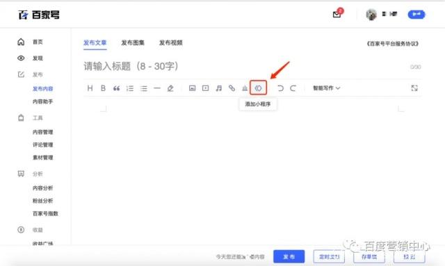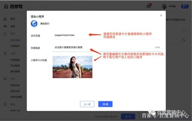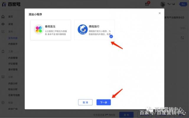 1、进入百家号后台,选择需要挂载的小程序并点击下一步。